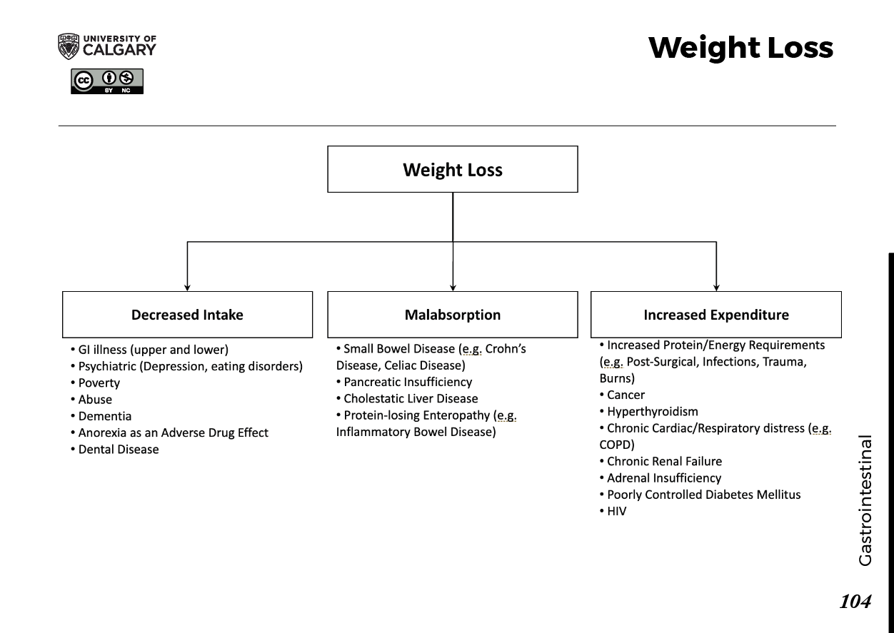 WEIGHT LOSS Main Categories Decreased Intake GI illness (upper and lower) Psychiatric (Depression, eating disorders) Poverty Abuse Dementia Anorexia as an Adverse Drug Effect Dental Disease Malabsorption Small Bowel Disease (e.g., Crohn’s Disease, Celiac Disease) Pancreatic Insufficiency Cholestatic Liver Disease Protein-losing Enteropathy (e.g., Inflammatory Bowel Disease) Increased Expenditure Increased Protein/Energy Requirements (e.g., Post-Surgical, Infections, Trauma, Burns) Cancer Hyperthyroidism Chronic Cardiac/Respiratory distress (e.g., COPD) Chronic Renal Failure Adrenal Insufficiency Poorly Controlled Diabetes Mellitus HIV