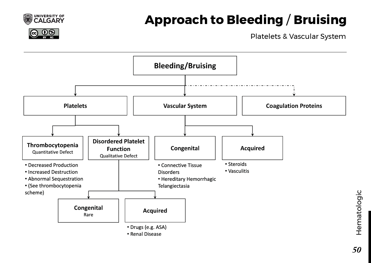 APPROACH TO BLEEDING/BRUISING: Platelets & Vascular System Bleeding/Bruising Platelets Thrombocytopenia (Quantitative Defect) Decreased Production Increased Destruction Abnormal Sequestration (See thrombocytopenia scheme) Disordered Platelet Function (Qualitative Defect) Congenital (Rare) Acquired Drugs (e.g., ASA) Renal Disease Vascular System Congenital Connective Tissue Disorders Hereditary Hemorrhagic Telangiectasia Acquired Steroids Vasculitis Coagulation Proteins