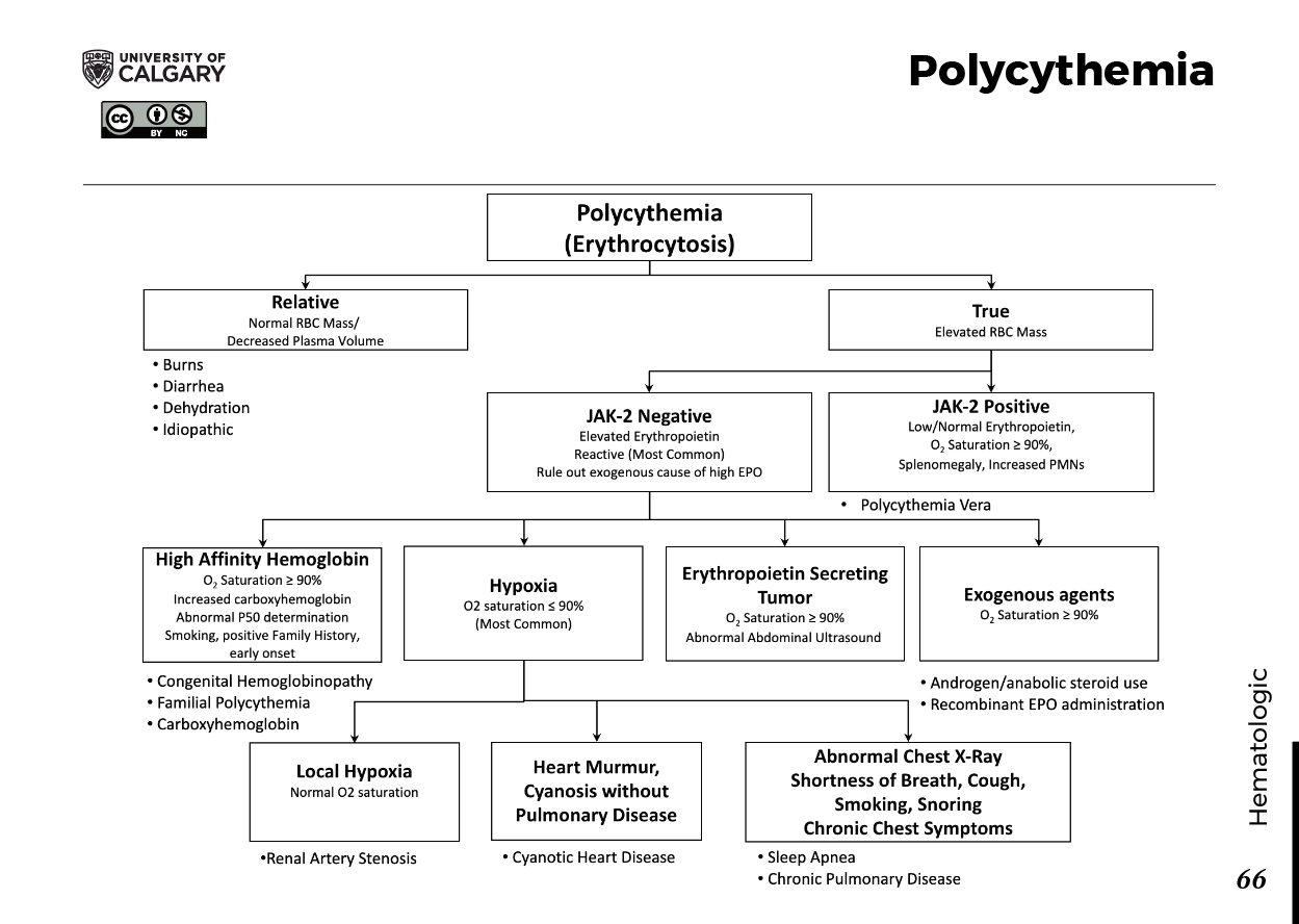 POLYCYTHEMIA (Erythrocytosis) Types Relative (Normal RBC Mass / Decreased Plasma Volume) Burns Diarrhea Dehydration Idiopathic True (Elevated RBC Mass) JAK-2 Negative Elevated Erythropoietin Reactive (Most Common) Rule out exogenous cause of high EPO JAK-2 Positive Low/Normal Erythropoietin O₂ Saturation ≥ 90% Splenomegaly, Increased PMNs Polycythemia Vera Causes High Affinity Hemoglobin O₂ Saturation ≥ 90% Increased carboxyhemoglobin Abnormal P50 determination Smoking, positive family history, early onset Congenital Hemoglobinopathy Familial Polycythemia Carboxyhemoglobin Hypoxia O₂ Saturation ≤ 90% (Most Common) Erythropoietin Secreting Tumor O₂ Saturation ≥ 90% Abnormal Abdominal Ultrasound Exogenous Agents O₂ Saturation ≥ 90% Androgen/anabolic steroid use Recombinant EPO administration Associated Conditions Local Hypoxia (Normal O₂ Saturation) Renal Artery Stenosis Heart Murmur, Cyanosis without Pulmonary Disease Cyanotic Heart Disease Abnormal Chest X-Ray, Shortness of Breath, Cough, Smoking, Snoring, Chronic Chest Symptoms Sleep Apnea Chronic Pulmonary Disease