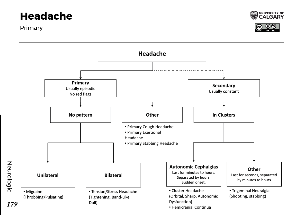 Headache Primary (Usually episodic, No red flags) No pattern Unilateral Migraine (Throbbing/Pulsating) Bilateral Tension/Stress Headache (Tightening, Band-Like, Dull) Other Primary Cough Headache Primary Exertional Headache Primary Stabbing Headache In Clusters Autonomic Cephalalgias Last for minutes to hours, separated by hours, sudden onset Cluster Headache (Orbital, Sharp, Autonomic Dysfunction) Hemicranial Continua Other Last for seconds, separated by minutes to hours Trigeminal Neuralgia (Shooting, stabbing) Secondary (Usually constant)