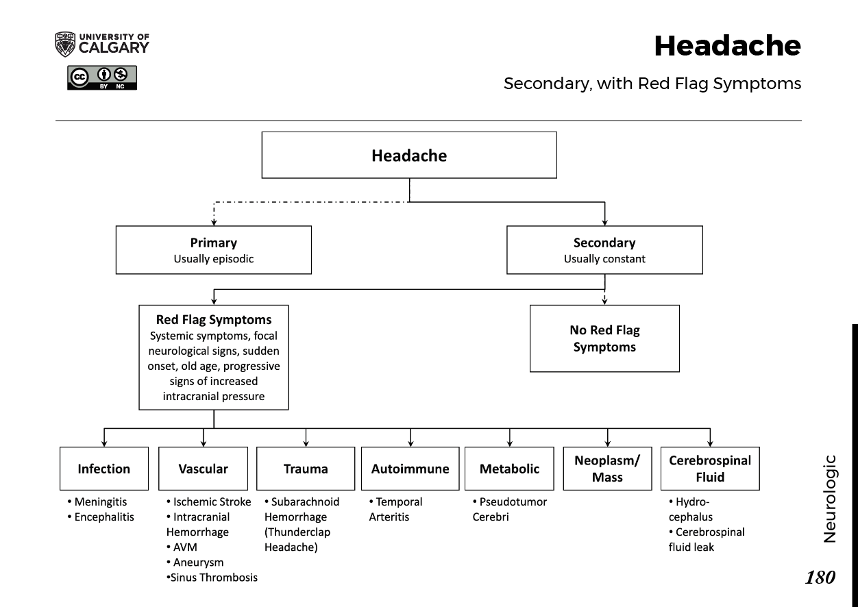HEADACHE: Secondary, with Red Flag Symptoms Headache Primary (Usually episodic) Secondary (Usually constant) Red Flag Symptoms Systemic symptoms Focal neurological signs Sudden onset Old age Progressive signs of increased intracranial pressure Causes with Red Flag Symptoms Infection Meningitis Encephalitis Vascular Ischemic Stroke Intracranial Hemorrhage AVM Aneurysm Sinus Thrombosis Trauma Subarachnoid Hemorrhage (Thunderclap Headache) Autoimmune Temporal Arteritis Metabolic Pseudotumor Cerebri Neoplasm/Mass Cerebrospinal Fluid Hydrocephalus Cerebrospinal fluid leak