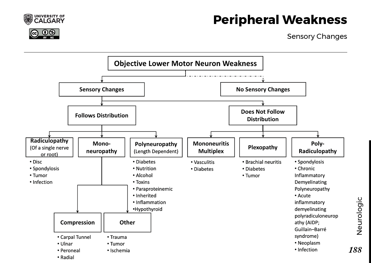 PERIPHERAL WEAKNESS: Sensory Changes Objective Lower Motor Neuron Weakness Sensory Changes Follows Distribution Radiculopathy (Of a single nerve or root) Disc Spondylosis Tumor Infection Mononeuropathy Compression Carpal Tunnel Ulnar Peroneal Radial Other Trauma Tumor Ischemia Polyneuropathy (Length Dependent) Diabetes Nutrition Alcohol Toxins Paraproteinemic Inherited Inflammation Hypothyroid No Sensory Changes Does Not Follow Distribution Mononeuritis Multiplex Vasculitis Diabetes Plexopathy Brachial neuritis Diabetes Tumor Poly-Radiculopathy Spondylosis Chronic Inflammatory Demyelinating Polyneuropathy Acute inflammatory demyelinating polyradiculoneuropathy (AIDP; Guillain-Barré syndrome) Neoplasm Infection