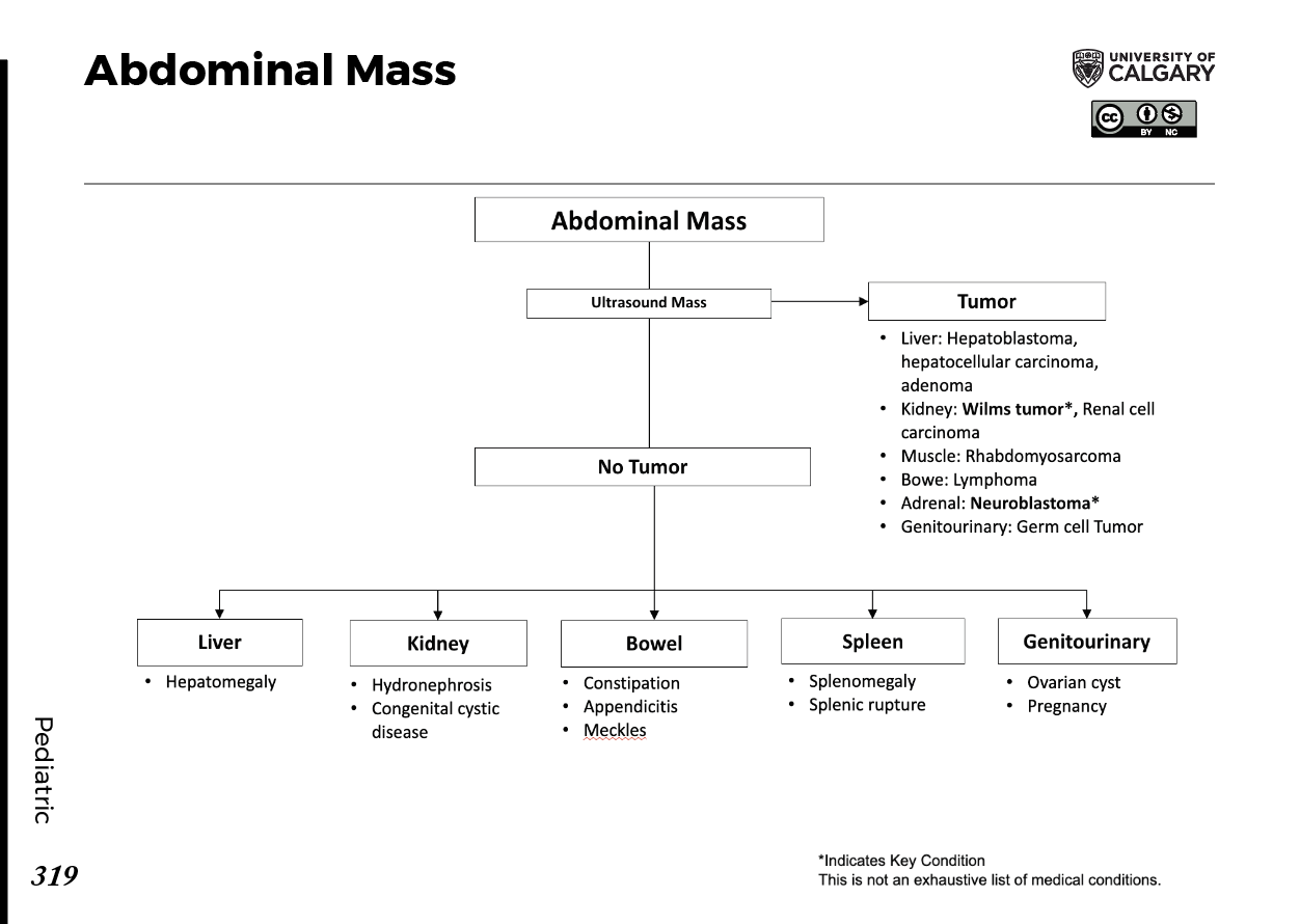 Abdominal Mass Ultrasound Mass Tumor Liver: Hepatoblastoma, Hepatocellular carcinoma, Adenoma Kidney: Wilms tumor*, Renal cell carcinoma Muscle: Rhabdomyosarcoma Bowel: Lymphoma Adrenal: Neuroblastoma* Genitourinary: Germ cell tumor No Tumor Liver: Hepatomegaly Kidney: Hydronephrosis, Congenital cystic disease Bowel: Constipation, Appendicitis, Meckel's Spleen: Splenomegaly, Splenic rupture Genitourinary: Ovarian cyst, Pregnancy Note: Indicates Key Condition This is not an exhaustive list of medical conditions