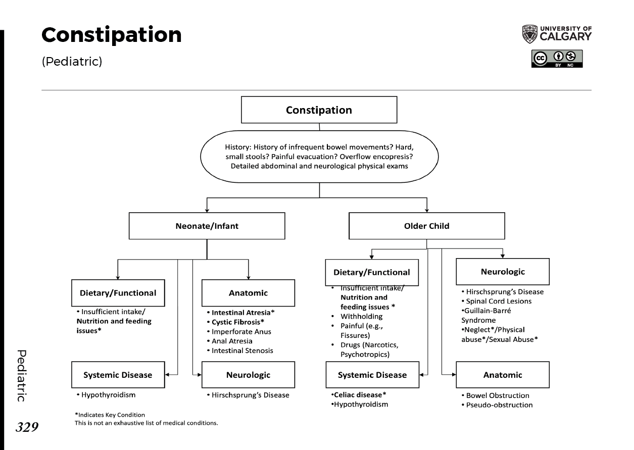 Constipation History Infrequent bowel movements? Hard, small stools? Painful evacuation? Overflow encopresis? Detailed abdominal and neurological physical exams Neonate / Infant Dietary / Functional Insufficient intake / Nutrition and feeding issues* Systemic Disease Hypothyroidism Anatomic Intestinal atresia Cystic fibrosis Imperforate anus Anal atresia Intestinal stenosis Neurologic Hirschsprung’s disease Older Child Dietary / Functional Insufficient intake / Nutrition and feeding issues* Withholding Painful (e.g., fissures) Drugs (narcotics, psychotropics) Systemic Disease Celiac disease Hypothyroidism Neurologic Hirschsprung’s disease Spinal cord lesions Guillain-Barré syndrome Neglect? / Physical abuse / Sexual abuse Anatomic Bowel obstruction Pseudo-obstruction *Indicates Key Condition This is not an exhaustive list of medical conditions.