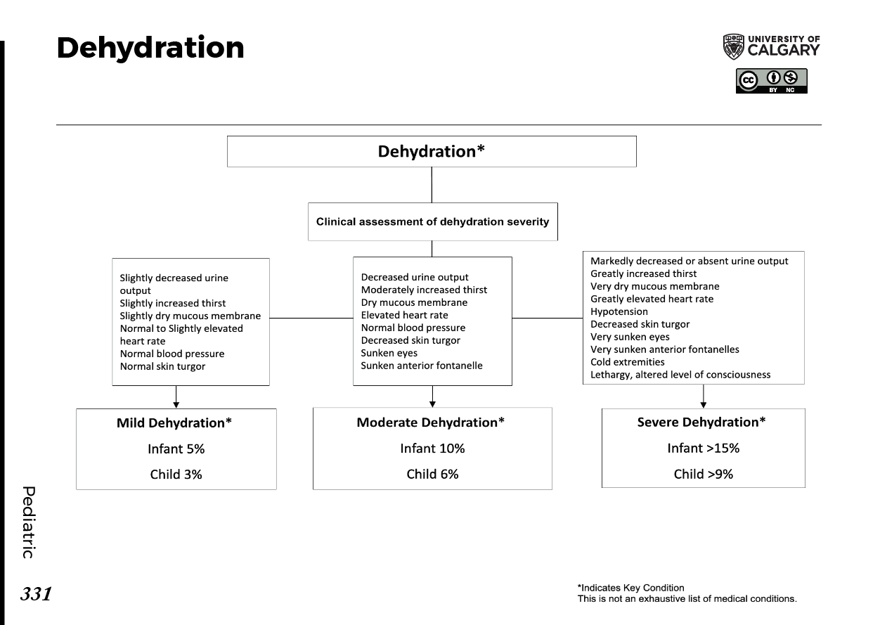 Dehydration* Mild Dehydration* Slightly decreased urine output Slightly increased thirst Slightly dry mucous membrane Normal to slightly elevated heart rate Normal blood pressure Normal skin turgor Body Weight Loss Infant: 5% Child: 3% Moderate Dehydration* Decreased urine output Moderately increased thirst Dry mucous membrane Elevated heart rate Normal blood pressure Decreased skin turgor Sunken eyes Sunken anterior fontanelle Body Weight Loss Infant: 10% Child: 6% Severe Dehydration* Markedly decreased or absent urine output Greatly increased thirst Very dry mucous membrane Greatly elevated heart rate Hypotension Decreased skin turgor Very sunken eyes Very sunken anterior fontanelle Cold extremities Lethargy, altered level of consciousness Body Weight Loss Infant: >15% Child: >9% Notes: Indicates Key Condition This is not an exhaustive list of medical conditions