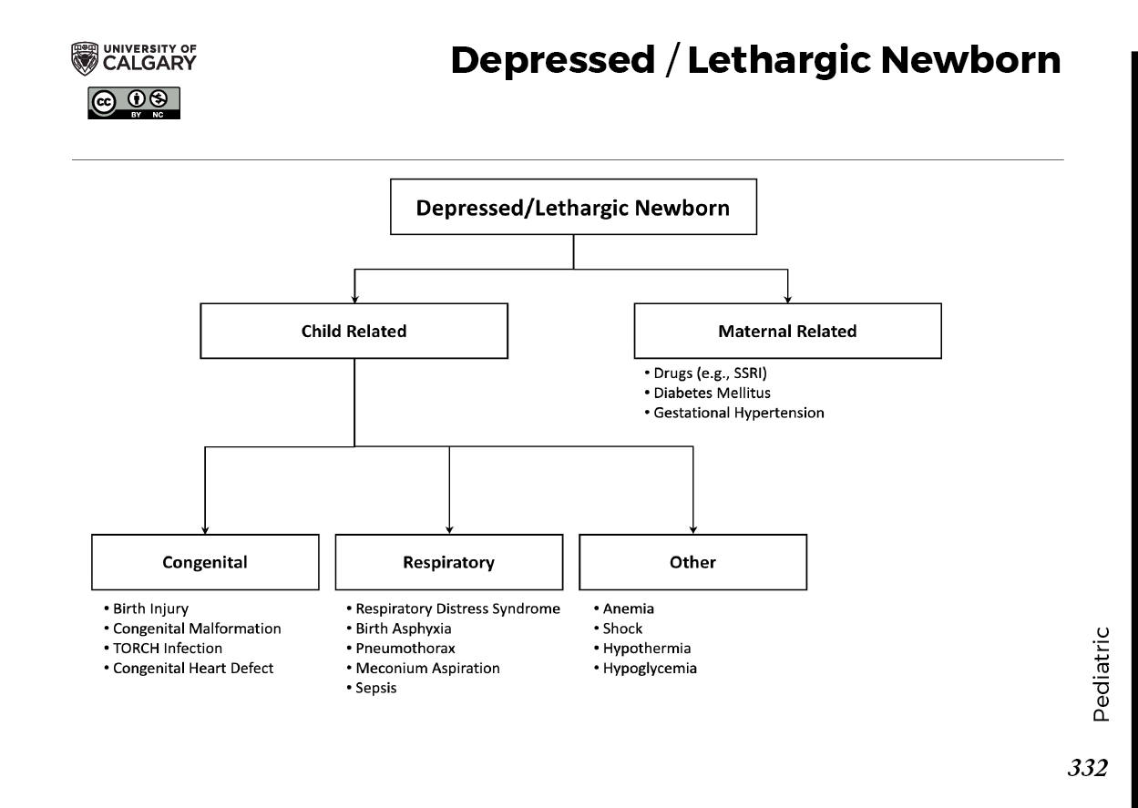 Depressed / Lethargic Newborn Child Related Congenital Birth injury Congenital malformation TORCH infection Congenital heart defect Respiratory Respiratory distress syndrome Birth asphyxia Pneumothorax Meconium aspiration Sepsis Other Anemia Shock Hypothermia Hypoglycemia Maternal Related Drugs (e.g., SSRI) Diabetes mellitus Gestational hypertension