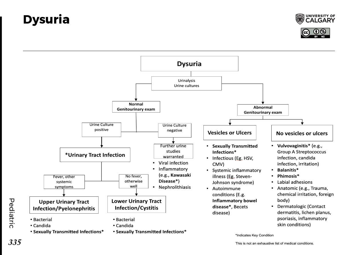 Dysuria Urinalysis Urine cultures Normal Genitourinary Exam Urine Culture Positive → Urinary Tract Infection Upper Urinary Tract Infection/Pyelonephritis Fever, other systemic symptoms Causes: Bacterial Candida Sexually Transmitted Infections Lower Urinary Tract Infection/Cystitis No fever, otherwise well Causes: Bacterial Candida Sexually Transmitted Infections Urine Culture Negative → Further urine studies warranted Viral infection Inflammatory (e.g., Kawasaki Disease) Nephrolithiasis Abnormal Genitourinary Exam Vesicles or Ulcers Sexually Transmitted Infections Infectious (e.g., HSV, CMV) Systemic inflammatory illness (e.g., Stevens-Johnson syndrome) Autoimmune conditions (e.g., Inflammatory bowel disease, Behçet’s disease) No Vesicles or Ulcers Vulvovaginitis (e.g., Group A Streptococcus infection, candida infection, irritation) Balanitis Phimosis Labial adhesions Anatomic (e.g., Trauma, chemical irritation, foreign body) Dermatologic (Contact dermatitis, lichen planus, psoriasis, inflammatory skin conditions) *Indicates Key Condition This is not an exhaustive list of medical conditions.
