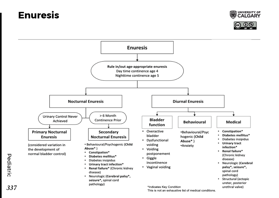 Enuresis Definition: Daytime continence by age 4 Nighttime continence by age 5 Nocturnal Enuresis Primary Nocturnal Enuresis Urinary control never achieved Secondary Nocturnal Enuresis 6 months of prior continence Causes Behavioural / Psychogenic (e.g., Child abuse) Constipation Diabetes mellitus Diabetes insipidus Urinary tract infection Renal failure (Chronic kidney disease) Neurologic (e.g., Cerebral palsy, Seizure, Spinal cord pathology) Diurnal Enuresis Bladder Function Overactive bladder Dysfunctional voiding Voiding postponement Giggle incontinence Vaginal voiding Behavioural Behavioural / Psychogenic (e.g., Child abuse) Anxiety Medical Constipation Diabetes mellitus Diabetes insipidus Urinary tract infection Renal failure (Chronic kidney disease) Neurologic (e.g., Cerebral palsy, Seizure, Spinal cord pathology) Structural (e.g., ectopic ureter, posterior urethral valve) * Indicates Key Condition This is not an exhaustive list of medical conditions.