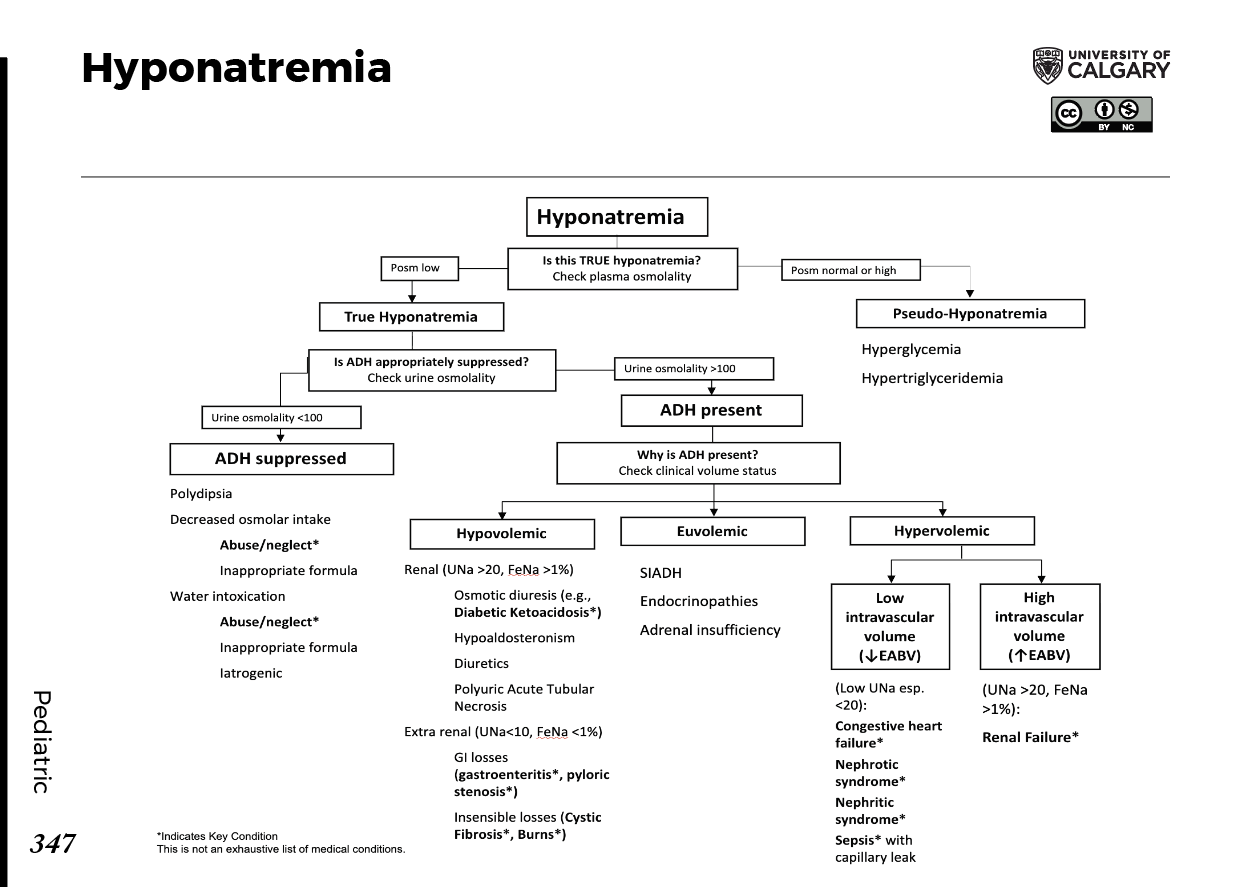 Hyponatremia Is this TRUE hyponatremia? Check plasma osmolality Posm low → True Hyponatremia Posm normal or high → Pseudo-Hyponatremia Hyperglycemia Hypertriglyceridemia True Hyponatremia Is ADH appropriately suppressed? Check urine osmolality Urine osmolality <100 → ADH suppressed Polydipsia Decreased osmolar intake Abuse/neglect* Inappropriate formula Water intoxication Abuse/neglect* Inappropriate formula Iatrogenic ADH present Urine osmolality >100 Why is ADH present? Check clinical volume status Hypovolemic Renal (UNa >20, FeNa >1%) Osmotic diuresis (e.g., Diabetic Ketoacidosis*) Hypoaldosteronism Diuretics Polyuric Acute Tubular Necrosis Extra renal (UNa <10, FeNa <1%) GI losses (gastroenteritis, pyloric stenosis*) Insensible losses (Cystic Fibrosis, Burns*) Euvolemic SIADH Endocrinopathies Adrenal insufficiency Hypervolemic Low intravascular volume (↓ EABV) (Low UNa esp. <20): Congestive heart failure* Nephrotic syndrome* Nephritic syndrome* Sepsis* with capillary leak High intravascular volume (↑ EABV) (UNa >20, FeNa >1%): Renal Failure* *Indicates Key Condition This is not an exhaustive list of medical conditions.