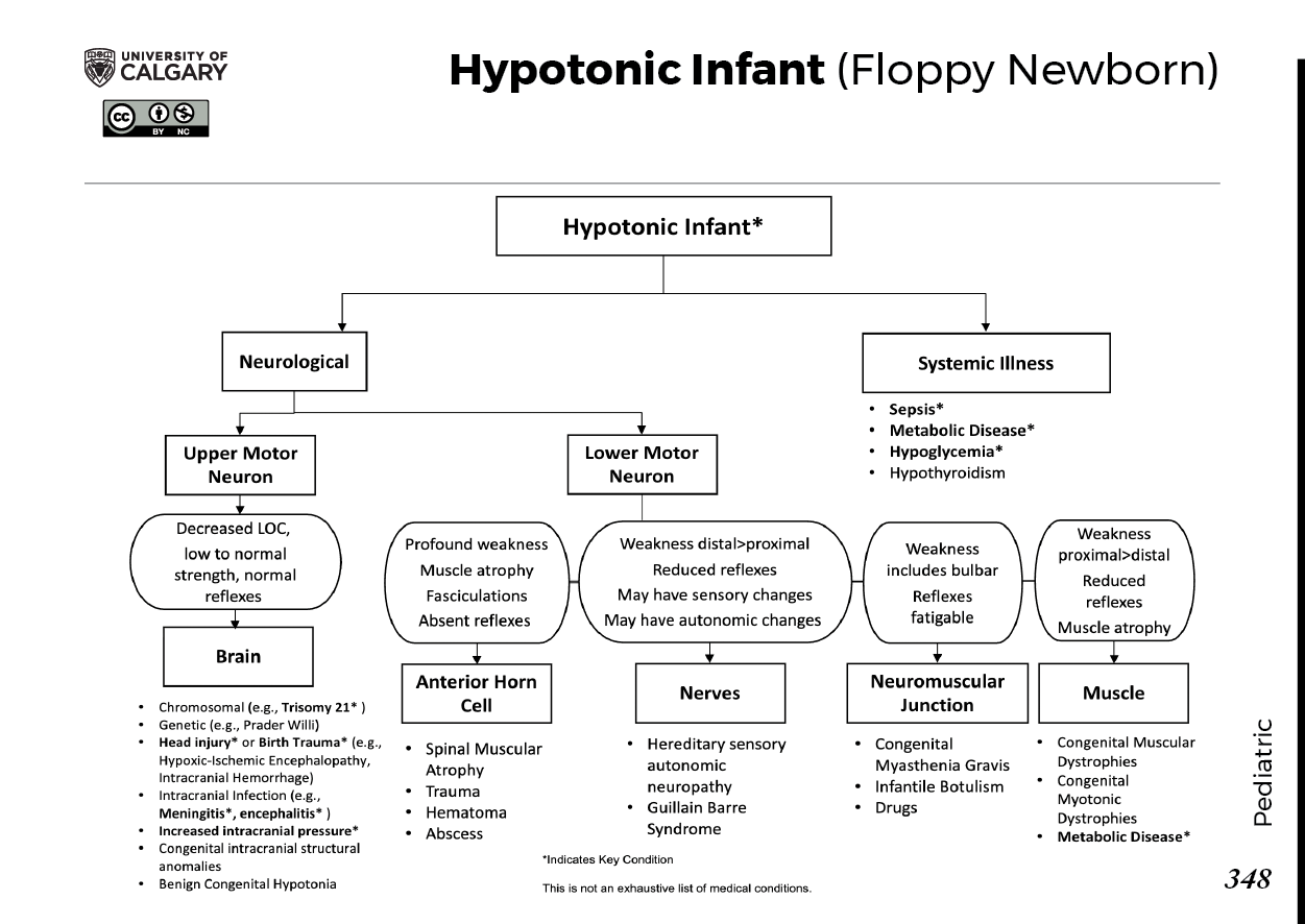 Hypotonic Infant* Neurological Upper Motor Neuron ↓ LOC ↓/normal strength Normal reflexes Brain Causes Chromosomal (e.g., Trisomy 21) Genetic (e.g., Prader Willi) Head injury* / Birth trauma* Hypoxic-Ischemic Encephalopathy Intracranial Hemorrhage Intracranial infection (e.g., Meningitis, Encephalitis) ↑ Intracranial pressure* Congenital intracranial structural anomalies Benign congenital hypotonia Lower Motor Neuron Profound weakness Muscle atrophy Fasciculations Absent reflexes Causes Anterior Horn Cell Spinal muscular atrophy Trauma Hematoma Abscess Nerves Hereditary sensory autonomic neuropathy Guillain-Barré syndrome Systemic Illness Sepsis Metabolic disease Hypoglycemia Hypothyroidism Symptoms Weakness (proximal > distal) ↓ Reflexes Muscle atrophy