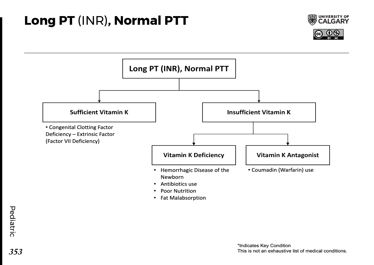 Long PT (INR), Normal PTT 1. Sufficient Vitamin K Congenital Clotting Factor Deficiency – Extrinsic Factor Factor VII Deficiency 2. Insufficient Vitamin K → Vitamin K Deficiency Hemorrhagic Disease of the Newborn Antibiotics use Poor Nutrition Fat Malabsorption → Vitamin K Antagonist Coumadin (Warfarin) use Notes: Indicates Key Condition This is not an exhaustive list of medical conditions