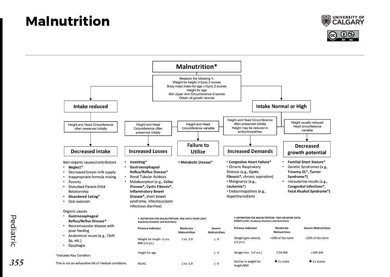 malnutrition Measure the following ǂ: Weight for height (<2yrs) Z-scores Body mass index-for-age (>2yrs) Z-scores Height for age Mid Upper Arm Circumference Z-scores Obtain all growth records Intake reduced Height and Head Circumference often preserved initially Decreased intake Non-organic causes/contributors Neglect* Decreased breast milk supply Inappropriate formula mixing Poverty Disturbed Parent-Child Relationship Disordered Eating* Oral aversion Organic causes Gastroesophageal Reflux/Reflux Disease* Neuromuscular disease with poor feeding Anatomical issues (e.g., Cleft lip, etc.) Dysphagia Intake Normal or High Height and Head Circumference often preserved initially Height and Head Circumference variable Height and Head Circumference often preserved initially Height may be reduced in endocrinopathies Height usually reduced Head circumference variable Increased Losses Vomiting* Gastroesophageal Reflux/Reflux Disease* Renal Tubular Acidosis Malabsorption (eg Celiac Disease*, Cystic Fibrosis*, Inflammatory Bowel Disease*, short bowel syndrome, infectious/post-infectious diarrhea) Failure to Utilize Metabolic Disease* Increased Demands Congestive Heart Failure* Chronic Respiratory Distress (e.g. Cystic Fibrosis*, chronic aspiration) Malignancy (eg Leukemia*) Endocrinopathies (eg Hyperthyroidism) Decreased growth potential Familial Short Stature* Genetic Syndromes (e.g. Trisomy 21*, Turner Syndrome*) Intrauterine insults (e.g. Congenital infections*, Fetal Alcohol Syndrome*)