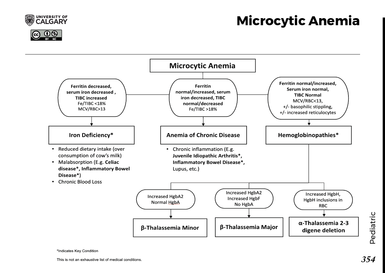 Microcytic Anemia Iron Deficiency* Ferritin decreased, serum iron decreased, TIBC increased Fe/TIBC <18% MCV/RBC <13 Causes: Reduced dietary intake (over consumption of cow’s milk) Malabsorption (e.g., Celiac disease, Inflammatory Bowel Disease) Chronic Blood Loss Anemia of Chronic Disease Ferritin normal/increased, serum iron decreased, TIBC normal/decreased Fe/TIBC >18% Causes: Chronic inflammation (e.g., Juvenile Idiopathic Arthritis, Inflammatory Bowel Disease, Lupus, etc.) Hemoglobinopathies* Ferritin normal/increased, serum iron normal, TIBC normal MCV/RBC <13 +/- basophilic stippling +/- increased reticulocytes Types: β-Thalassemia Minor Increased HgbA2 Normal HgbA β-Thalassemia Major Increased HgbA2 Increased HgbF No HgbA α-Thalassemia 2–3 gene deletion Increased HgbH HgbH inclusions in RBC *Indicates Key Condition This is not an exhaustive list of medical conditions.
