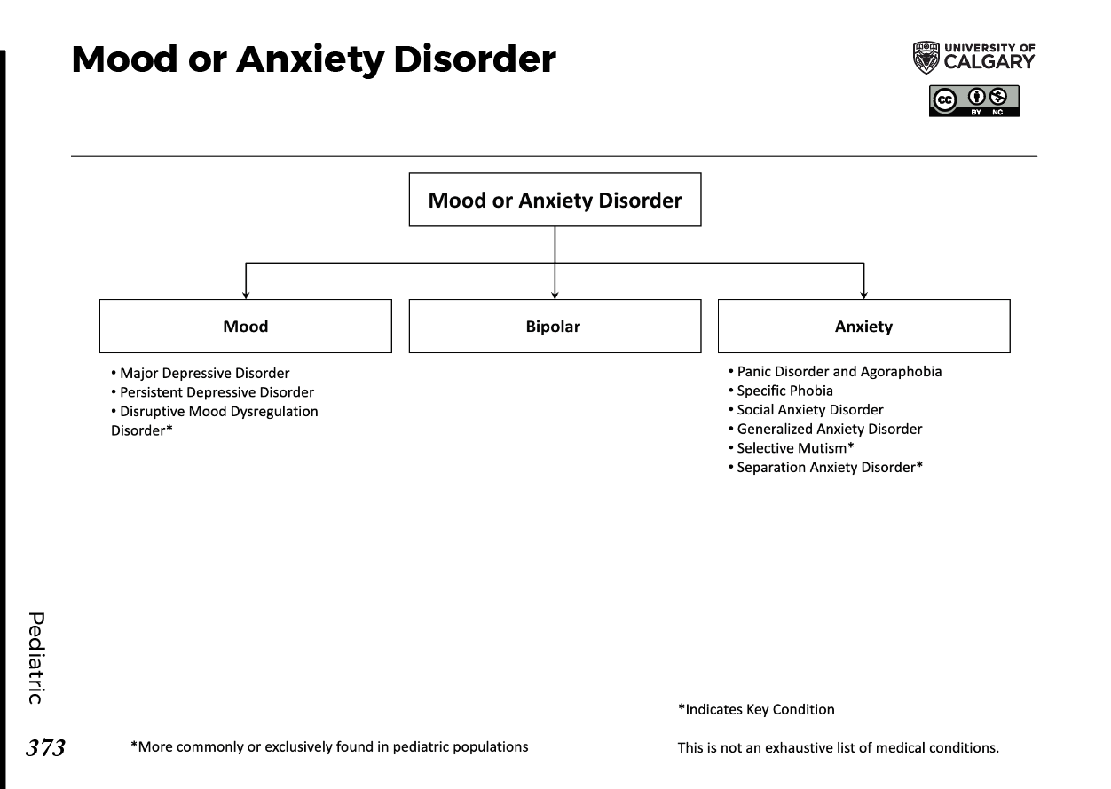 Mood Disorders Major Depressive Disorder Persistent Depressive Disorder Disruptive Mood Dysregulation Disorder * Bipolar Disorders (No specific disorders listed) Anxiety Disorders Panic Disorder and Agoraphobia Specific Phobia Social Anxiety Disorder Generalized Anxiety Disorder Selective Mutism * Separation Anxiety Disorder * Footnotes: More commonly or exclusively found in pediatric populations Indicates Key Condition This is not an exhaustive list of medical conditions