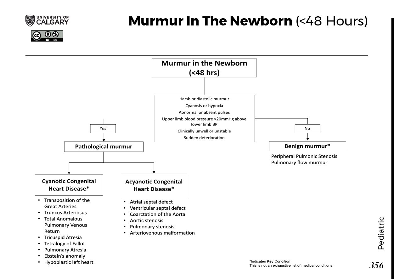 Murmur in the Newborn (<48 hrs) Harsh or diastolic murmur Cyanosis or hypoxia Abnormal or absent pulses Upper limb blood pressure ≥20 mmHg above lower limb BP Clinically unwell or unstable Sudden deterioration Yes → Pathological murmur Cyanotic Congenital Heart Disease* Transposition of the Great Arteries Truncus Arteriosus Total Anomalous Pulmonary Venous Return Tricuspid Atresia Tetralogy of Fallot Pulmonary Atresia Ebstein’s anomaly Hypoplastic left heart Acyanotic Congenital Heart Disease* Atrial septal defect Ventricular septal defect Coarctation of the Aorta Aortic stenosis Pulmonary stenosis Arteriovenous malformation No → Benign murmur* Peripheral Pulmonic Stenosis Pulmonary flow murmur *Indicates Key Condition This is not an exhaustive list of medical conditions.