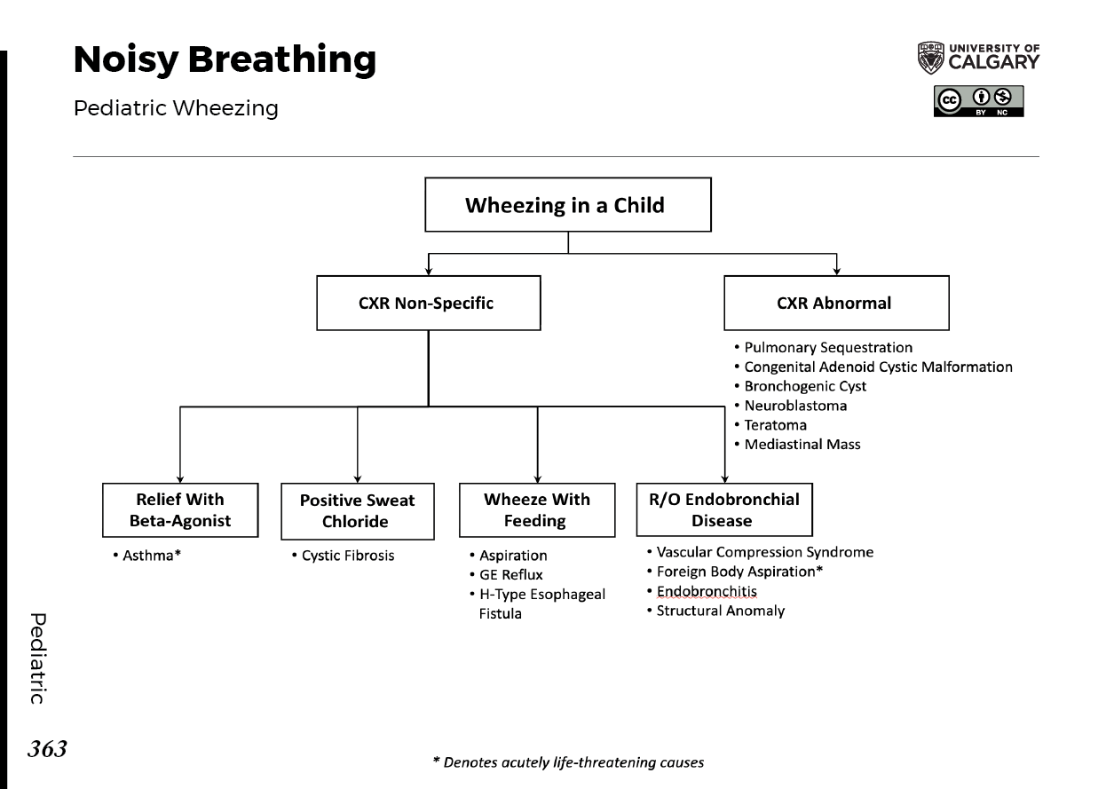 Wheezing in a Child CXR Non-Specific Relief With Beta-Agonist Asthma (acutely life-threatening) Positive Sweat Chloride Cystic Fibrosis Wheeze With Feeding Aspiration GE Reflux H-Type Esophageal Fistula R/O Endobronchial Disease Vascular Compression Syndrome Foreign Body Aspiration (acutely life-threatening) Endobronchitis Structural Anomaly CXR Abnormal Pulmonary Sequestration Congenital Adenoid Cystic Malformation Bronchogenic Cyst Neuroblastoma Teratoma Mediastinal Mass
