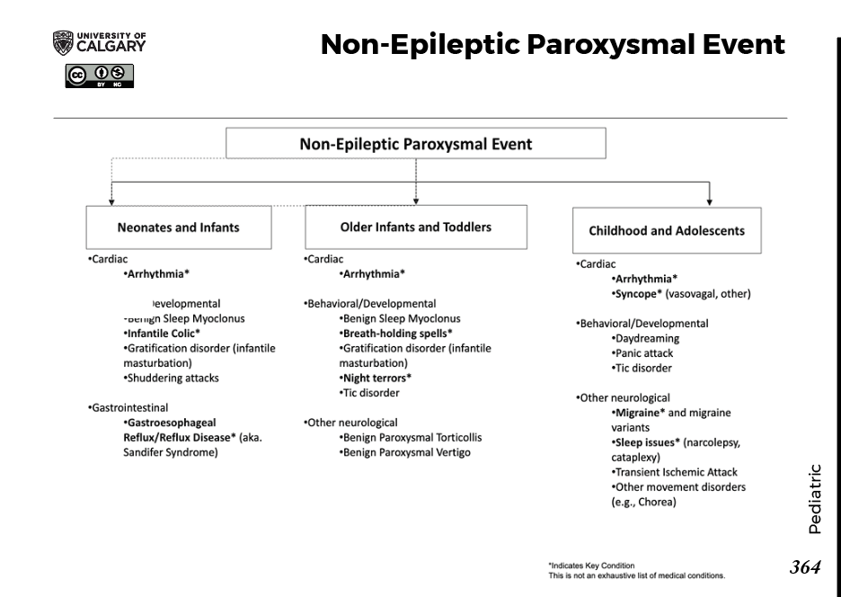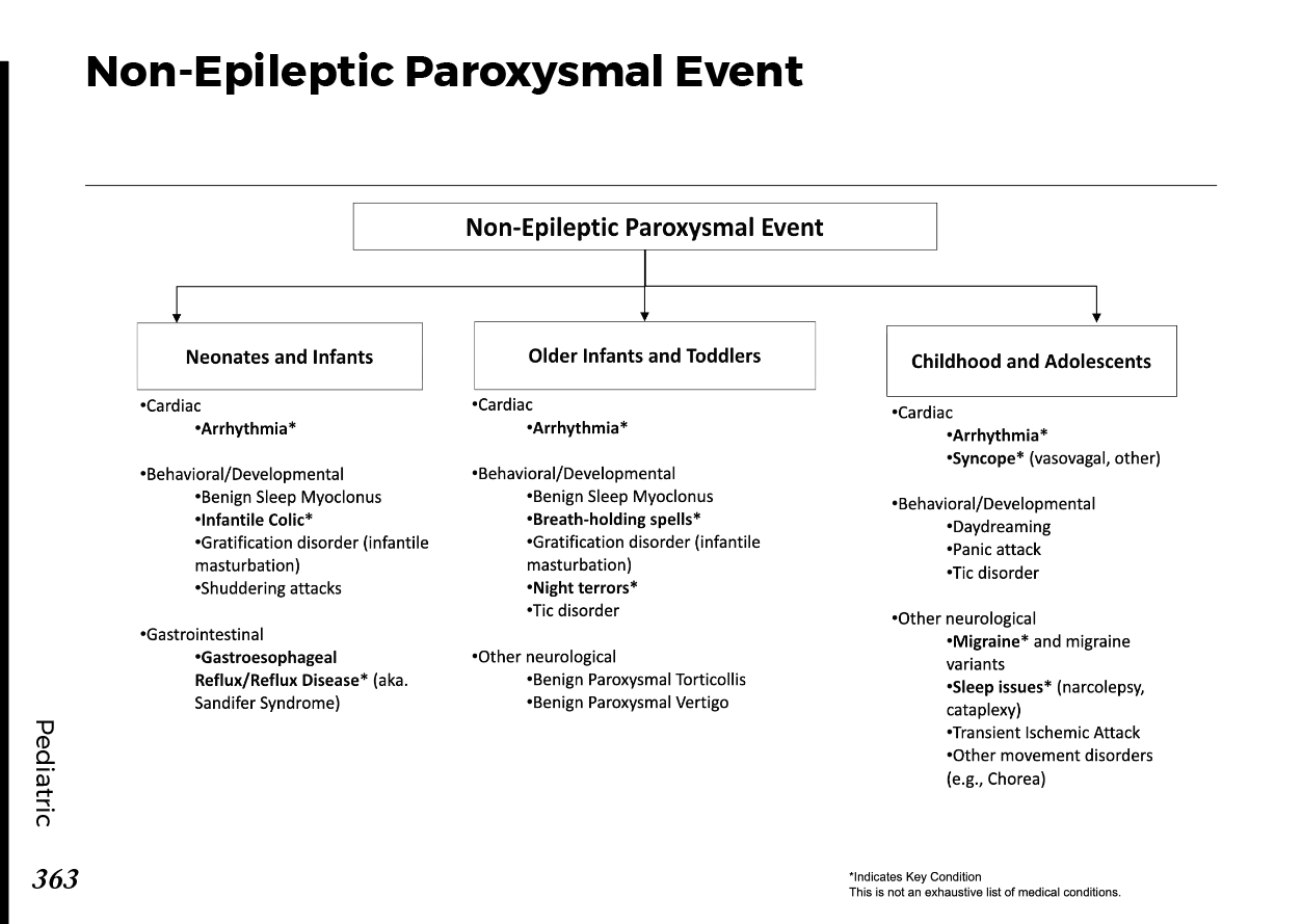 Non-Epileptic Paroxysmal Event Neonates and Infants Cardiac Arrhythmia Behavioral / Developmental Benign sleep myoclonus Infantile colic Gratification disorder (infantile masturbation) Shuddering attacks Gastrointestinal Gastroesophageal reflux / Reflux disease (Sandifer Syndrome) Older Infants and Toddlers Cardiac Arrhythmia Behavioral / Developmental Benign sleep myoclonus Breath-holding spells Gratification disorder (infantile masturbation) Night terrors Tic disorder Other Neurological Benign paroxysmal torticollis Benign paroxysmal vertigo Childhood and Adolescents Cardiac Arrhythmia Syncope (vasovagal, other) Behavioral / Developmental Daydreaming Panic attack Tic disorder Other Neurological Migraine and migraine variants Sleep issues (e.g., narcolepsy, cataplexy) Transient ischemic attack Other movement disorders (e.g., chorea) * Indicates Key Condition This is not an exhaustive list of medical conditions.
