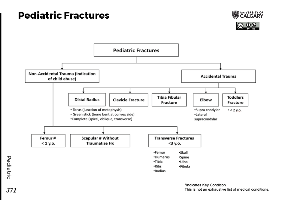 Pediatric Fractures Non-Accidental Trauma (Indication of child abuse) Distal Radius Torus (junction of metaphysis) Greenstick (bone bent at convex side) Complete (spiral, oblique, transverse) Clavicle Fracture Tibia / Fibular Fracture Femur Fracture < 1 y.o. Scapular Fracture Without Traumatizing History Femur Humerus Tibia Ribs Radius Transverse Fractures < 3 y.o. Femur Skull Humerus Spine Tibia Ulna Ribs Fibula Radius Accidental Trauma Elbow Supracondylar Lateral supracondylar Toddler’s Fracture < 2 years old * Indicates Key Condition This is not an exhaustive list of medical conditions.
