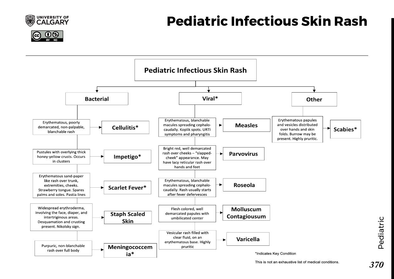 Pediatric Infectious Skin Rash Bacterial Cellulitis* Erythematous, poorly demarcated, non-palpable, blanchable rash Impetigo* Pustules with overlying thick honey-yellow crusts. Occurs in clusters Scarlet Fever* Erythematous sand-paper like rash over trunk, extremities, cheeks Strawberry tongue Spares palms and soles Pastia lines Staph Scaled Skin Widespread erythema involving the face, diaper, and intertriginous areas Desquamation and crusting present Nikolsky sign Meningococcemia* Purpuric, non-blanchable rash over full body Viral* Measles Erythematous, blanchable macules spreading cephalo-caudally Koplik spots URTI symptoms and pharyngitis Parvovirus Bright red, well demarcated rash over cheeks – “slapped-cheek” appearance May have lacy reticular rash over hands and feet Roseola Erythematous, blanchable macules spreading cephalo-caudally Rash usually starts after fever defervescence Molluscum Contagiosum Flesh colored, well demarcated papules with umbilicated center Varicella Vesicular rash filled with clear fluid, on an erythematous base Highly pruritic Other Scabies* Erythematous papules and vesicles distributed over hands and skin folds Burrow may be present Highly pruritic *Indicates Key Condition This is not an exhaustive list of medical conditions.