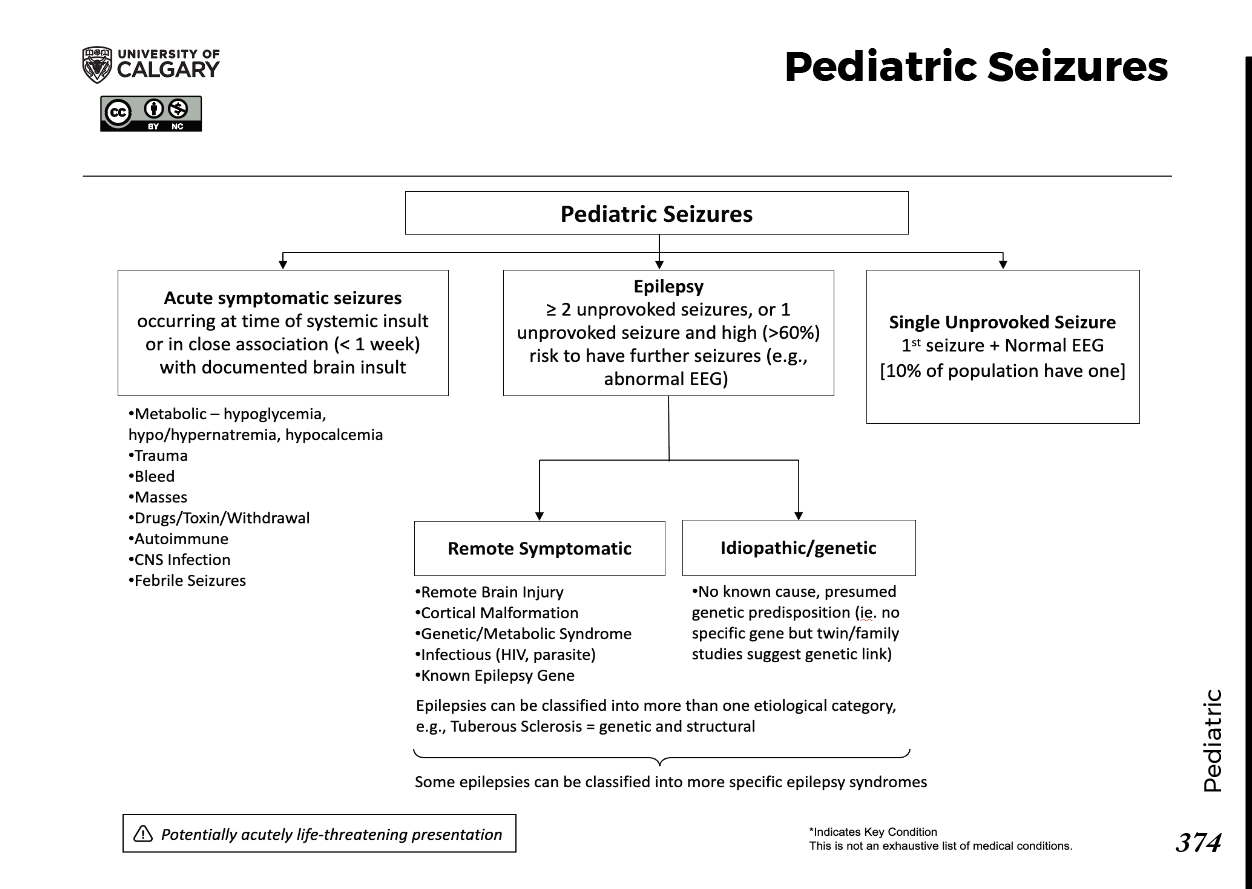 Pediatric Seizures 1. Acute Symptomatic Seizures Occur at the time of systemic insult or in close association (<1 week) with documented brain insult. Causes include: Metabolic (hypoglycemia, hypo/hypernatremia, hypocalcemia) Trauma Bleed Masses Drugs/Toxin/Withdrawal Autoimmune CNS Infection Febrile Seizures 2. Epilepsy Defined as: ≥2 unprovoked seizures OR 1 unprovoked seizure with high risk (>60%) of further seizures (e.g., abnormal EEG) Types: Remote Symptomatic Remote brain injury Cortical malformation Genetic/metabolic syndrome Infectious (HIV, parasite) Known epilepsy gene Idiopathic/Genetic No known cause Presumed genetic (no specific gene identified, but twin/family studies suggest genetic link) 3. Single Unprovoked Seizure First seizure with normal EEG ~10% of population have one Notes: Some epilepsies can be classified into more than one etiological category Some epilepsies can be classified into more specific epilepsy syndromes Some conditions are potentially acutely life-threatening (*)