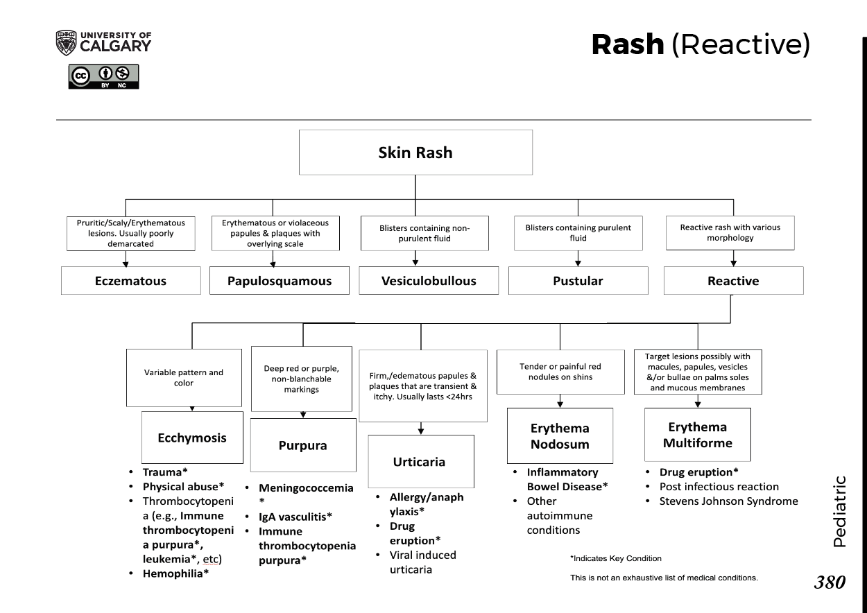 Skin Rash (Reactive and Related Types) Eczematous Pruritic/Scaly/Erythematous lesions Usually poorly demarcated Papulosquamous Erythematous or violaceous papules & plaques with overlying scale Vesiculobullous Blisters containing non-purulent fluid Pustular Blisters containing purulent fluid Reactive Reactive rash with various morphology Examples: Ecchymosis Variable pattern and color Causes: Trauma Physical abuse Thrombocytopenia (e.g., Immune thrombocytopenia purpura, leukemia) Hemophilia Purpura Deep red or purple, non-blanchable markings Causes: Meningococcemia IgA vasculitis Immune thrombocytopenia purpura Urticaria Firm/edematous papules & plaques that are transient & itchy Usually lasts <24 hrs Causes: Allergy/anaphylaxis Drug eruption Viral induced urticaria Erythema Nodosum Tender or painful red nodules on shins Causes: Inflammatory Bowel Disease Other autoimmune conditions Erythema Multiforme Target lesions possibly with macules, papules, vesicles &/or bullae on palms, soles, and mucous membranes Causes: Drug eruption Post-infectious reaction Stevens-Johnson Syndrome *Indicates Key Condition This is not an exhaustive list of medical conditions.