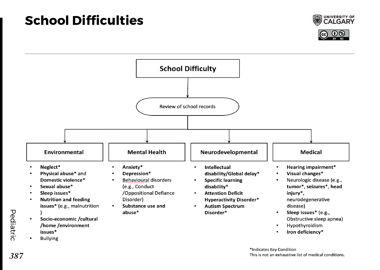 SCHOOL DIFFICULTIES difficulty review of school records environmental. neglect physical abuse and domestic violence sexual abuse sleep issues nutrition and feeding issues malnutrition socio-economic cultural home environment issues bullying mental health anxiety depression behavioral disorders conduct oppositional defiance disorder substance use and abuse neurodevelopmental intellectual disability global delay specific learning disability attention-deficit hyperactivity disorder autism spectrum disorder medical hearing impairment visual changes neurological disease tumor seizures head injury neurodegenerative disease sleep issues obstructive sleep apnea hypothyroidism iron deficiency indicates key condition this is not an exhaustive list of medical conditions