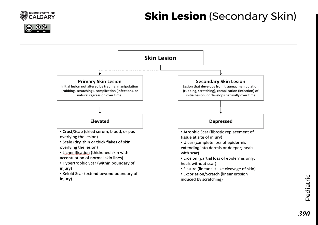 Skin Lesion (Secondary) Primary Skin Lesion Initial lesion not altered by trauma, manipulation (rubbing, scratching), complication (infection), or natural regression over time. Secondary Skin Lesion Lesion that develops from trauma, manipulation (rubbing, scratching), complication (infection) of initial lesion, or develops naturally over time. Types Elevated Crust/Scab (dried serum, blood, or pus overlying the lesion) Scale (dry, thin or thick flakes of skin overlying the lesion) Lichenification (thickened skin with accentuation of normal skin lines) Hypertrophic Scar (within boundary of injury) Keloid Scar (extend beyond boundary of injury) Depressed Atrophic Scar (fibrotic replacement of tissue at site of injury) Ulcer (complete loss of epidermis extending into dermis or deeper; heals with scar) Erosion (partial loss of epidermis only; heals without scar) Fissure (linear slit-like cleavage of skin) Excoriation/Scratch (linear erosion induced by scratching)