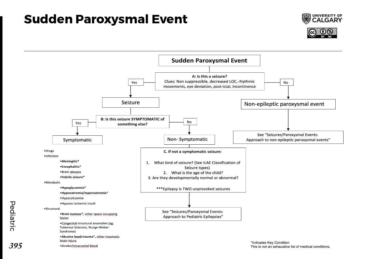 Sudden Paroxysmal Event A. Is this a seizure? Clues Non-suppressible ↓ LOC Rhythmic movements Eye deviation Post-ictal state Incontinence If YES → Seizure If NO → Non-epileptic paroxysmal event → See: Seizures/Paroxysmal Events: Approach to Non-Epileptic Paroxysmal Events B. Is this seizure SYMPTOMATIC of something else? If YES → Symptomatic Causes Drugs Infection Meningitis Encephalitis Brain abscess Febrile seizure Metabolic Hypoglycaemia Hyponatraemia / Hypernatraemia Hypocalcaemia Structural Brain tumour / other space-occupying lesion Congenital structural anomalies (e.g., Tuberous Sclerosis, Sturge-Weber Syndrome) Abusive head trauma / other traumatic brain injury Stroke / intracranial bleed → See: Seizures/Paroxysmal Events: Approach to Pediatric Epilepsies If NO → Non-Symptomatic Ask What kind of seizure? → See: ILAE Classification of Seizure Types What is the age of the child? Are they developmentally normal or abnormal? Note: Epilepsy = 2 unprovoked seizures → See: Seizures/Paroxysmal Events: Approach to Pediatric Epilepsies * Indicates Key Condition This is not an exhaustive list of medical conditions.