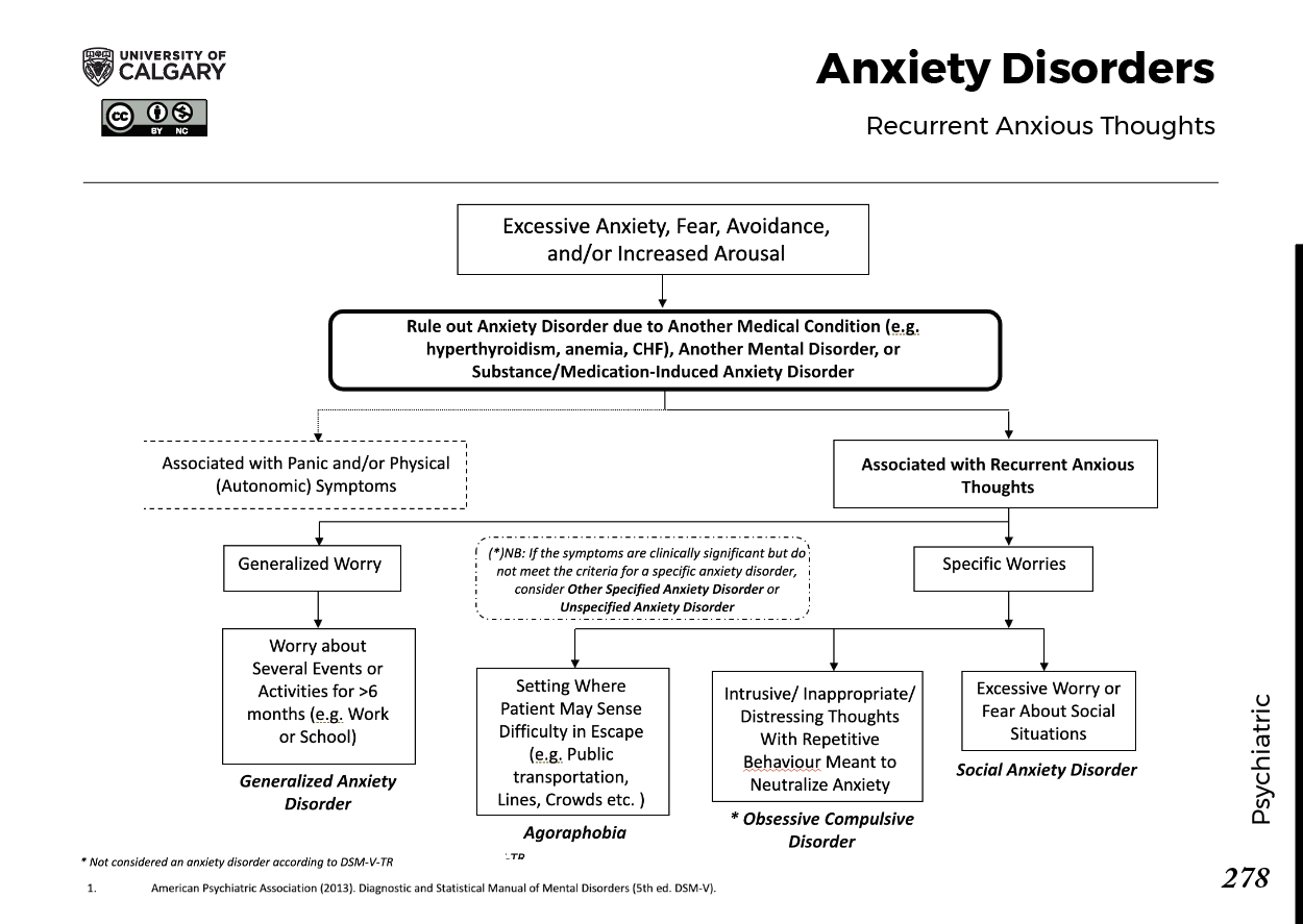 ANXIETY DISORDERS: Recurrent Anxious Thoughts Core Feature Excessive Anxiety, Fear, Avoidance, and/or Increased Arousal Rule Out Anxiety Disorder due to: Another Medical Condition (e.g., hyperthyroidism, anemia, CHF) Another Mental Disorder Substance/Medication-Induced Anxiety Disorder Associated Features Associated with Panic and/or Physical (Autonomic) Symptoms Generalized Worry Worry about several events or activities for >6 months (e.g., Work or School) Generalized Anxiety Disorder Associated with Recurrent Anxious Thoughts Specific Worries Setting where patient may sense difficulty in escape (e.g., Public transportation, Lines, Crowds, etc.) Agoraphobia Intrusive/Inappropriate/Distressing Thoughts with Repetitive Behaviour Meant to Neutralize Anxiety Obsessive Compulsive Disorder (Not considered an anxiety disorder according to DSM-IV-TR) Excessive Worry or Fear About Social Situations Social Anxiety Disorder Note: If symptoms are clinically significant but do not meet criteria for a specific anxiety disorder, consider Other Specified Anxiety Disorder or Unspecified Anxiety Disorder.