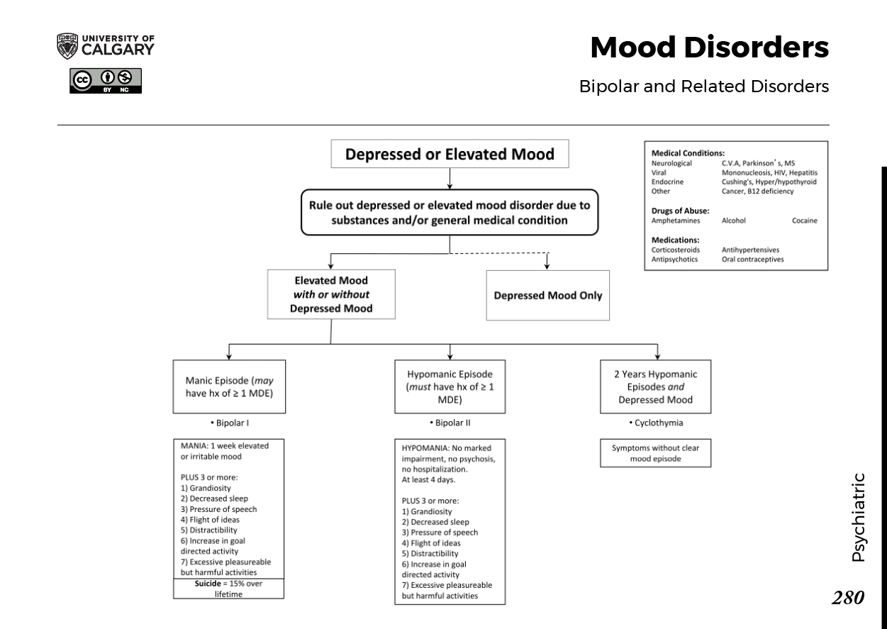 Depressed or Elevated Mood Rule out depressed or elevated mood disorder due to substances and/or general medical condition Elevated Mood with or without Depressed MoodManic Episode (may have hx of >= 1 MDE)Hypomanic Episode (must have hx of >= 1 MDE)2 Years Hypomanic Episodes and Depressed MoodDepressed Mood Only MANIA: 1 week elevated or irritable mood PLUS 3 or more: 1) Grandiosity 2) Decreased sleep 3) Pressure of speech 4) Flight of ideas 5) Distractibility 6) Increase in goal directed activity 7) Excessive pleasureable but harmful activities Suicide = 15% over lifetime Symptoms without clear mood episode HYPOMANIA: No marked impairment, no psychosis, no hospitalization. At least 4 days.PLUS 3 or more: 1) Grandiosity 2) Decreased sleep 3) Pressure of speech 4) Flight of ideas 5) Distractibility 6) Increase in goal directed activity 7) Excessive pleasureable but harmful activities MOOD DISORDERS: Elevated Mood Bipolar I Bipolar II Cyclothymia Medical Conditions: Neurological C.V.A, Parkinson's, MS Viral Mononucleosis, HIV, HepatitisEndocrine Cushing's, Hyper/hypothyroidOther Cancer, B12 deficiency Drugs of Abuse: Amphetamines Alcohol Cocaine Medications: Corticosteroids Antihypertensives Antipsychotics Oral contraceptives