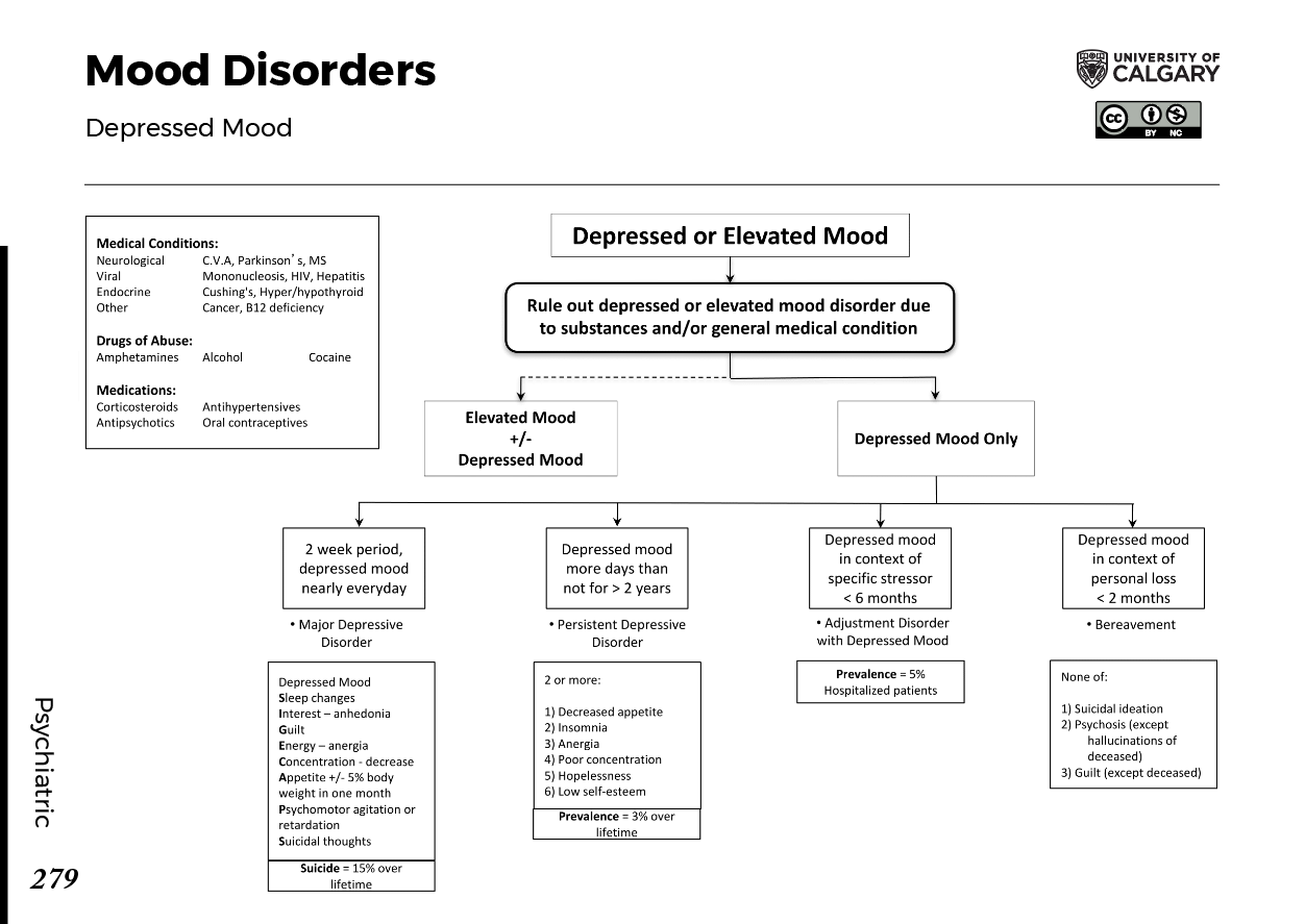 Depressed or Elevated Mood Rule out depressed or elevated mood disorder due to substances and/or general medical conditionElevated Mood +/- Depressed Mood2 week period, depressed mood nearly everyday Depressed mood more days than not for > 2 years Depressed mood in context of specific stressor < 6 months Depressed mood in context of personal loss< 2 months Depressed Mood OnlyDepressed Mood Sleep changes Interest - anhedonia GuiltEnergy - anergia Concentration - decrease Appetite +/- 5% body weight in one month Psychomotor agitation or retardation Suicidal thoughts Adjustment Disorder with Depressed Mood Bereavement2 or more:1) Decreased appetite2) Insomnia3) Anergia4) Poor concentration 5) Hopelessness 6) Low self-esteem Medical Conditions: Neurological C.V.A, Parkinson's, MSViral Mononucleosis, HIV, Hepatitis Endocrine Cushing's, Hyper/hypothyroid Other Cancer, B12 deficiency Drugs of Abuse: Amphetamines Alcohol Cocaine Medications: Corticosteroids Antihypertensives Antipsychotics Oral contraceptives Suicide = 15% over lifetime Prevalence = 3% over lifetime Prevalence = 5% Hospitalized patients None of:1) Suicidal ideation2) Psychosis (except hallucinations of deceased)3) Guilt (except deceased) MOOD DISORDERS: Depressed Mood Persistent Depressive Disorder Major Depressive Disorder