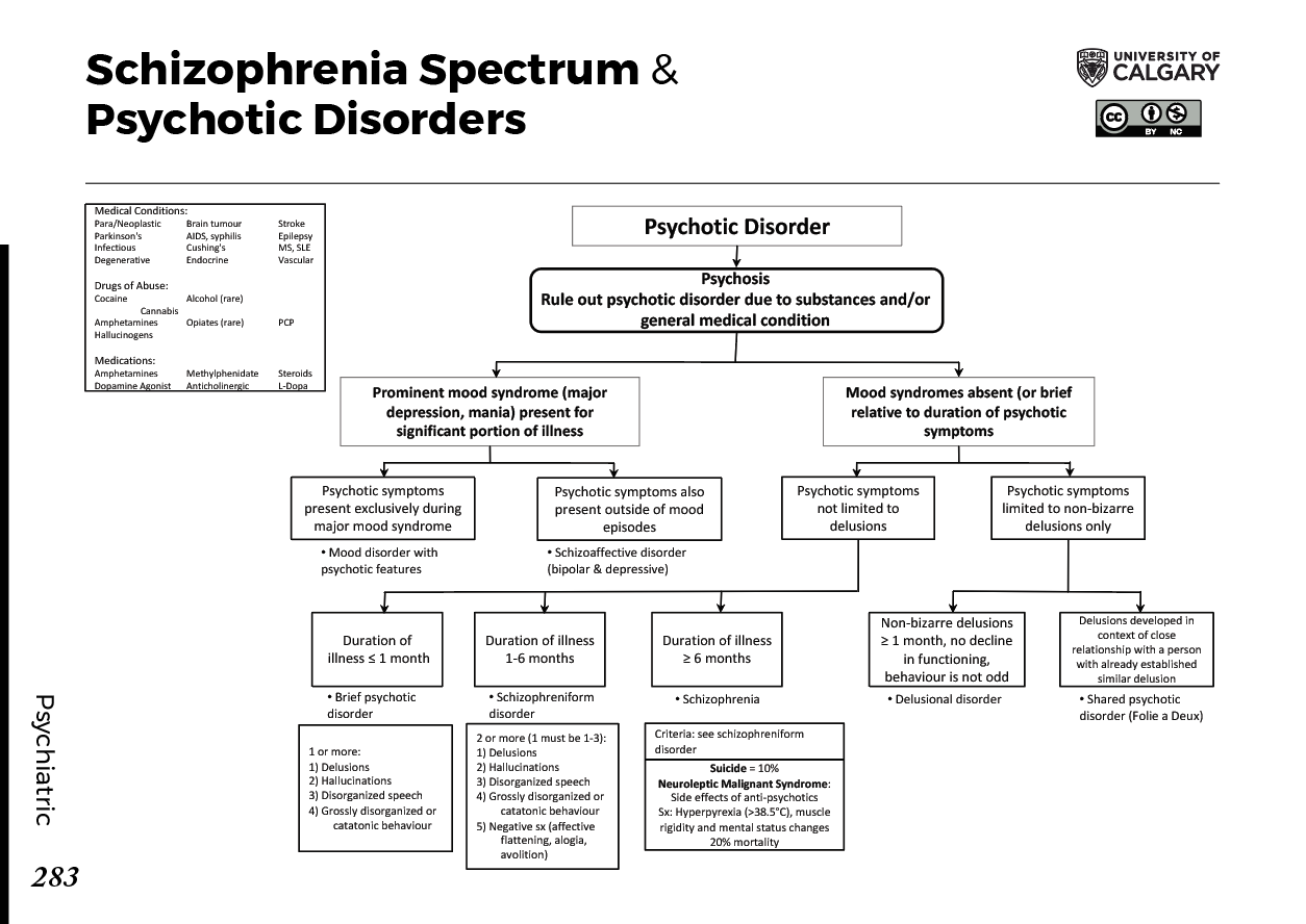 Psychotic Disorder Psychosis Rule out psychotic disorder due to substances and/or general medical condition Prominent mood syndrome (major depression, mania) present for significant portion of illnessDuration of illness <= 1 month Duration of illness1-6 months Duration of illness >= 6 months Non-bizarre delusions >= 1 month, no decline in functioning, behaviour is not odd Delusions developed in context of close relationship with a person with already established similar delusion Mood syndromes absent (or brief relative to duration of psychotic symptomsPsychotic symptoms present exclusively during major mood syndrome Psychotic symptoms not limited to delusionsPsychotic symptoms limited to non-bizarre delusions only 1 or more: 1) Delusions 2) Hallucinations 3) Disorganized speech 4) Grossly disorganized or catatonic behaviour Mood disorder with psychotic features Brief psychotic disorder Schizoaffective disorder (bipolar & depressive) Schizophrenia Schizophreniform disorder Shared psychotic disorder (Folie a Deux) Suicide = 10%Neuroleptic Malignant Syndrome: Side effects of anti-psychotics Sx: Hyperpyrexia (>38.5°C), muscle rigidity and mental status changes 20% mortalityPsychotic symptoms also present outside of mood episodes Delusional disorder2 or more (1 must be 1-3):1) Delusions 2) Hallucinations 3) Disorganized speech 4) Grossly disorganized or catatonic behaviour 5) Negative sx (affective flattening, alogia, avolition) Criteria: see schizophreniform disorderMedical Conditions: Para/Neoplastic Brain tumour Stroke Parkinson's AIDS, syphilis EpilepsyInfectious Cushing's MS, SLEDegenerative Endocrine Vascular Drugs of Abuse:Cocaine Alcohol (rare) Cannabis Amphetamines Opiates (rare) PCPHallucinogensMedications: Amphetamines Methylphenidate Steroids Dopamine Agonist Anticholinergic L-Dopa PSYCHOTIC DISORDERS