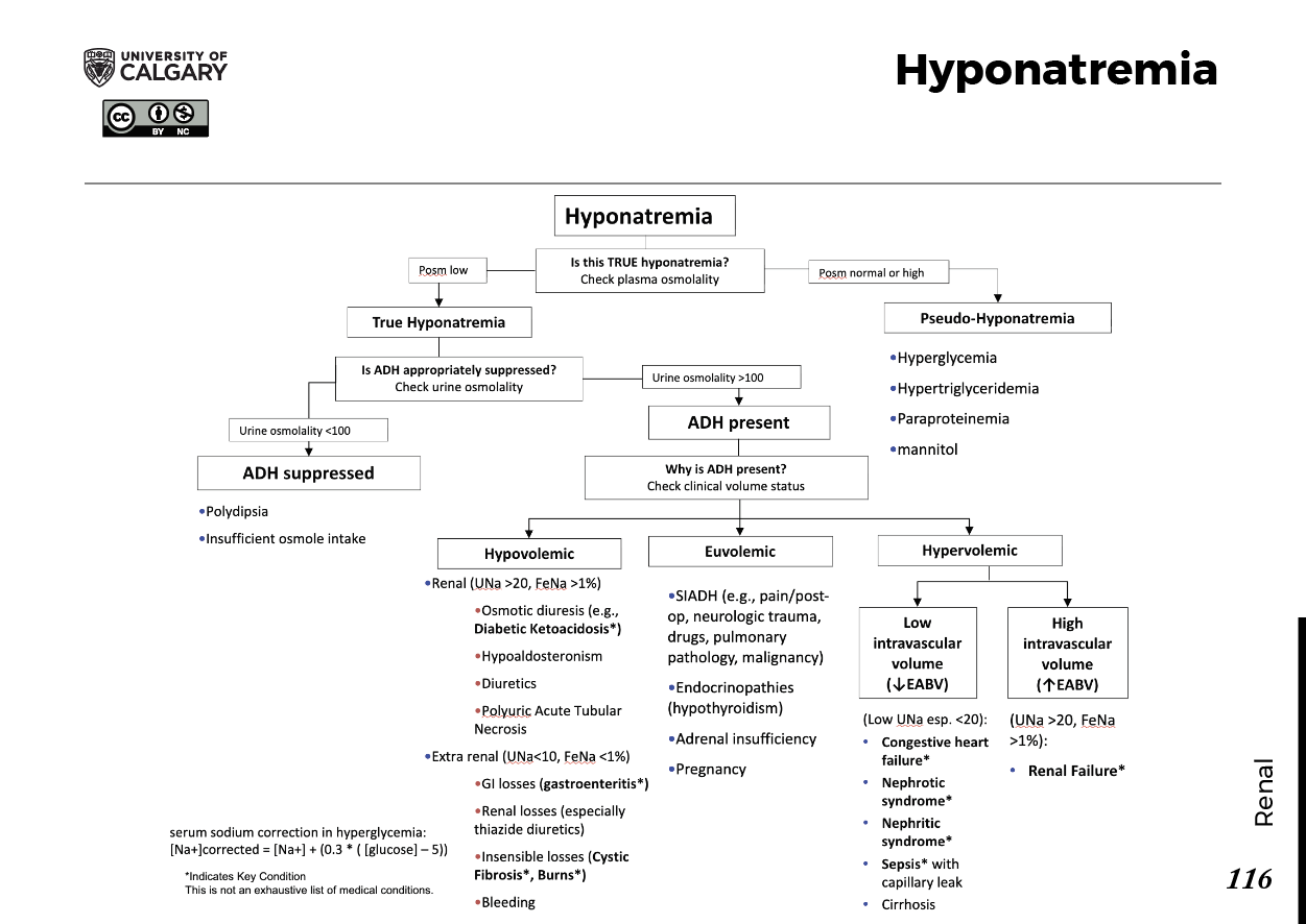 HYPONATREMIA Step 1: Is this TRUE hyponatremia? Check plasma osmolality: Posm low → True Hyponatremia Posm normal or high → Pseudo-Hyponatremia Causes: Hyperglycemia Hypertriglyceridemia Paraproteinemia Mannitol True Hyponatremia Is ADH appropriately suppressed? Check urine osmolality: Urine osmolality < 100 → ADH suppressed Causes: Polydipsia Insufficient osmole intake Urine osmolality > 100 → ADH present Why is ADH present? Check clinical volume status: Volume Status Categories Hypovolemic Renal (UNa > 20, FeNa > 1%) Osmotic diuresis (e.g., Diabetic Ketoacidosis*) Hypoaldosteronism Diuretics Polyuric Acute Tubular Necrosis Extra renal (UNa < 10, FeNa < 1%) GI losses (gastroenteritis*) Renal losses (especially thiazide diuretics) Insensible losses (Cystic Fibrosis*, Burns*) Bleeding Euvolemic SIADH (e.g., pain/post-op, neurologic trauma, drugs, pulmonary pathology, malignancy) Endocrinopathies (hypothyroidism) Adrenal insufficiency Pregnancy Hypervolemic Low intravascular volume (↓EABV) (Low UNa esp. < 20): Congestive heart failure* Nephrotic syndrome* Nephritic syndrome* Sepsis* with capillary leak High intravascular volume (↑EABV) (UNa > 20, FeNa > 1%): Renal Failure* Serum sodium correction in hyperglycemia: [Na⁺] corrected=[Na⁺]+(0.3×([glucose]−5))\text{[Na⁺] corrected} = \text{[Na⁺]} + (0.3 \times (\text{[glucose]} - 5)) [Na⁺] corrected=[Na⁺]+(0.3×([glucose]−5)) *Indicates Key Condition This is not an exhaustive list of medical conditions.