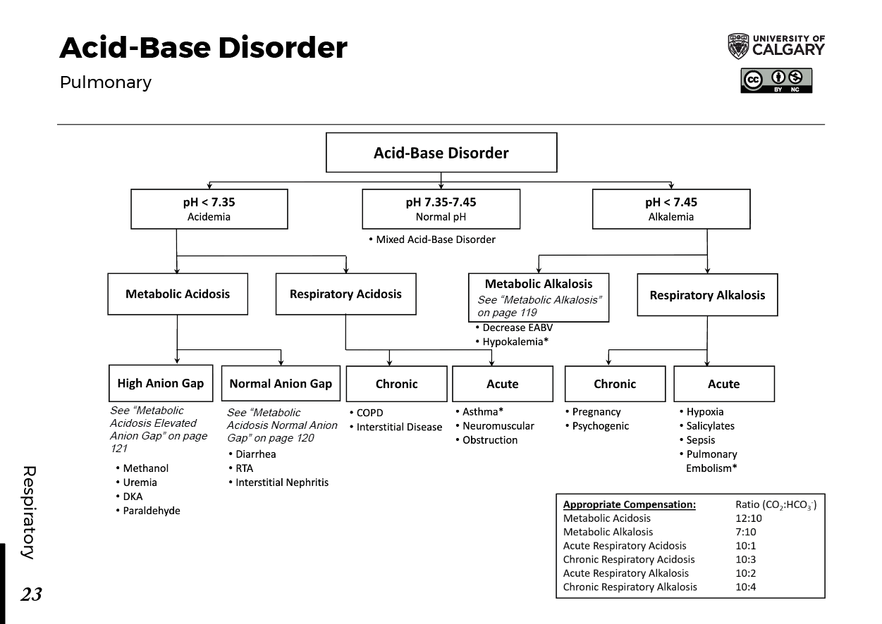 ACID-BASE DISORDER Acid-Base Disorder pH < 7.35 → Acidemia Metabolic Acidosis High Anion Gap See “Metabolic Acidosis Elevated Anion Gap” on page 121 Methanol Uremia DKA Paraldehyde Isoniazid Lactic Acid Ethylene Glycol Salicylates Normal Anion Gap See “Metabolic Acidosis Normal Anion Gap” on page 120 Diarrhea RTA Interstitial Nephritis Respiratory Acidosis Chronic COPD Interstitial Disease pH 7.35–7.45 → Normal pH Mixed Acid-Base Disorder pH > 7.45 → Alkalemia Metabolic Alkalosis See “Metabolic Alkalosis” on page 119 Decrease EABV Hypokalemia* Respiratory Alkalosis Chronic Pregnancy Psychogenic Acute Hypoxia Salicylates Sepsis Pulmonary Embolism* Note: Denotes acutely life-threatening causes Appropriate Compensation: Metabolic Acidosis → Ratio (CO₂:HCO₃⁻) = 12:10 Metabolic Alkalosis → 7:10 Acute Respiratory Acidosis → 10:1 Chronic Respiratory Acidosis → 10:3 Acute Respiratory Alkalosis → 10:2 Chronic Respiratory Alkalosis → 10:4