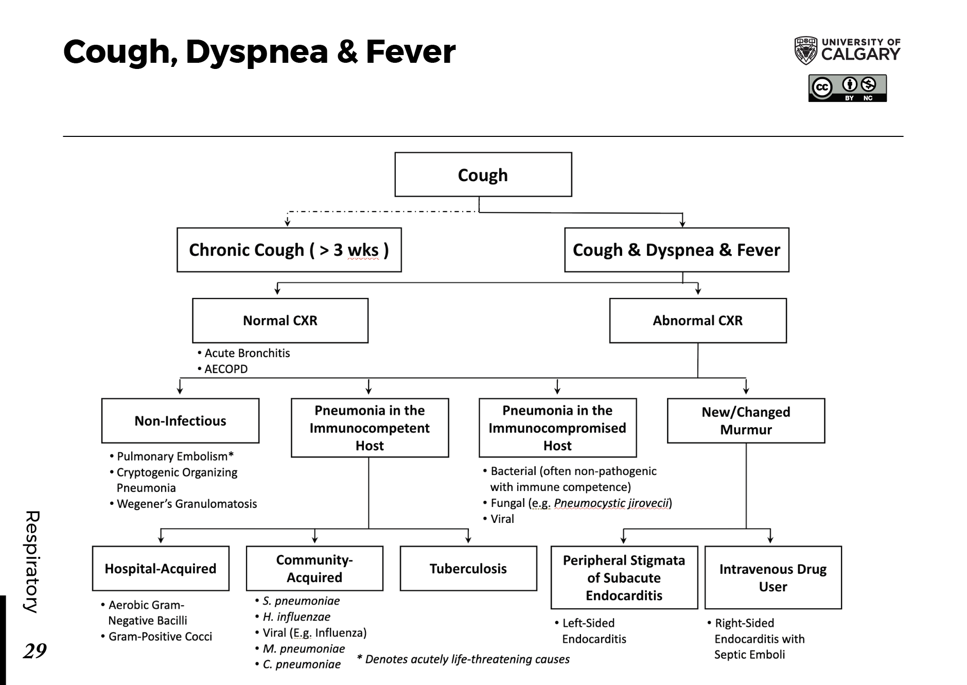 Cough, Dyspnea & Fever Cough Chronic Cough (> 3 wks) → Normal CXR Acute Bronchitis AECOPD Cough & Dyspnea & Fever → Abnormal CXR Non-Infectious Pulmonary Embolism* Cryptogenic Organizing Pneumonia Wegener’s Granulomatosis Pneumonia in the Immunocompetent Host Hospital-Acquired Aerobic Gram-Negative Bacilli Gram-Positive Cocci Community-Acquired S. pneumoniae H. influenzae Viral (e.g., Influenza) M. pneumoniae C. pneumoniae Tuberculosis Pneumonia in the Immunocompromised Host Bacterial (often non-pathogenic with immune competence) Fungal (e.g., Pneumocystis jirovecii) Viral Peripheral Stigmata of Subacute Endocarditis Left-Sided Endocarditis New/Changed Murmur Intravenous Drug User Right-Sided Endocarditis with Septic Emboli * Denotes acutely life-threatening causes
